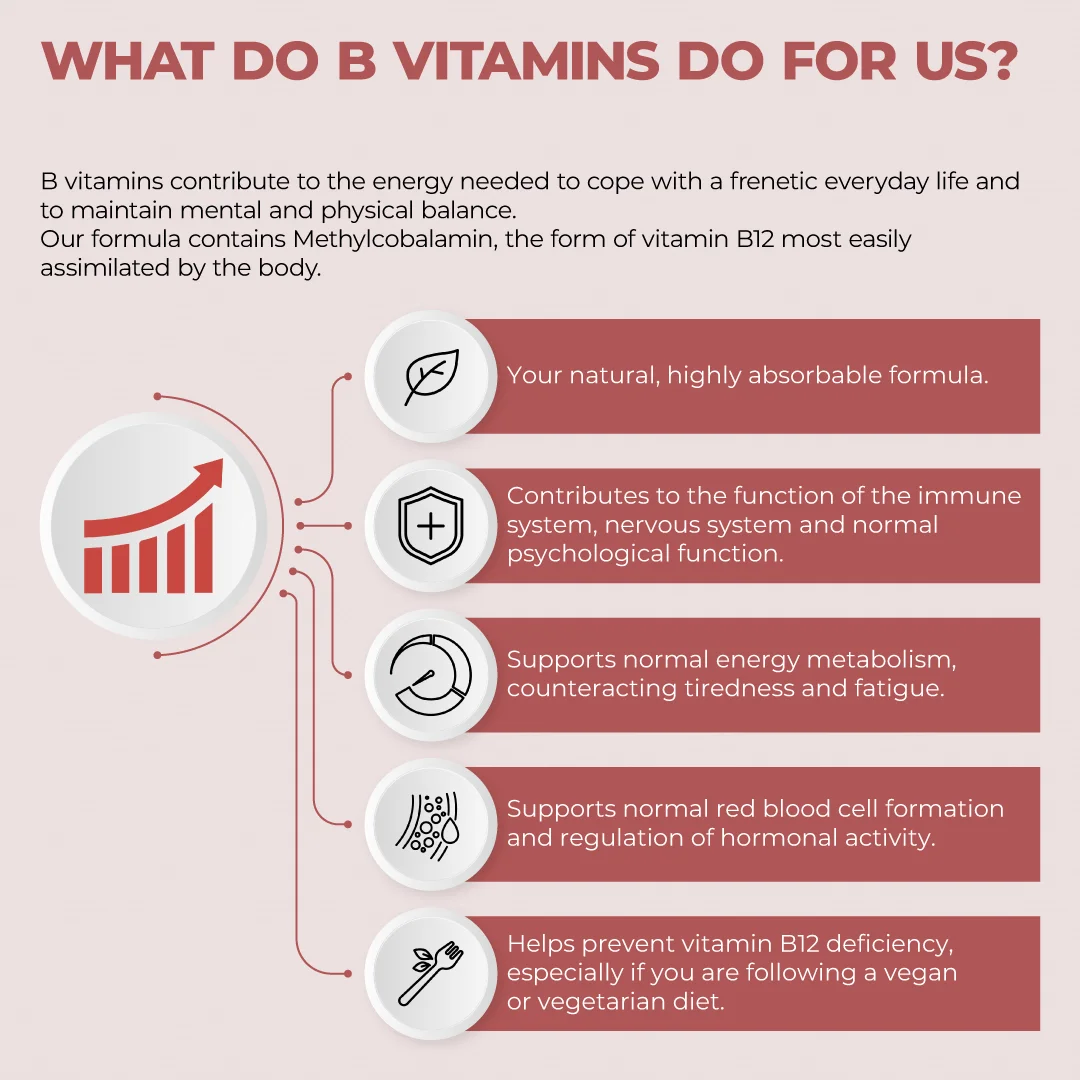 Vitamin B1, skupaj z B2, B6 in B12, prispeva k normalni presnovi in normalnemu delovanju živčnega sistema. Vitamin B1 prispeva k normalnemu delovanju srca. Vitamin B2 prispeva k ohranjanju normalnih rdečih krvnih celic in normalnemu metabolizmu železa, poleg tega ščiti celice pred oksidativnim stresom. Vitamin B2, skupaj z vitaminom B6 in B12, prispeva tudi k zmanjšanju utrujenosti in izčrpanosti. Vitamin B6, skupaj z B12, prispeva k normalnemu delovanju imunskega sistema in k normalni tvorbi rdečih krvnih celic. Vitamin B12 sodeluje tudi v procesu delitve celic.