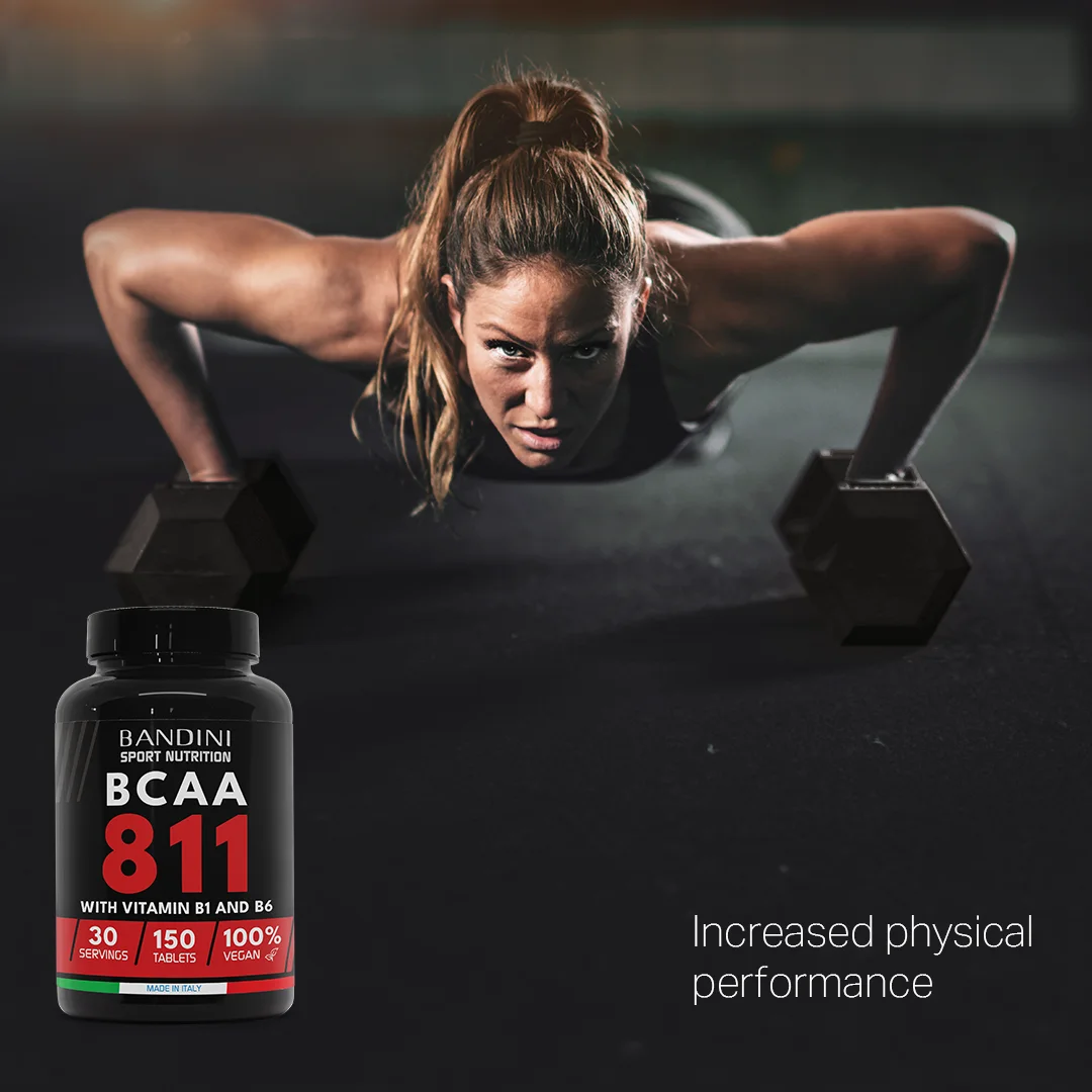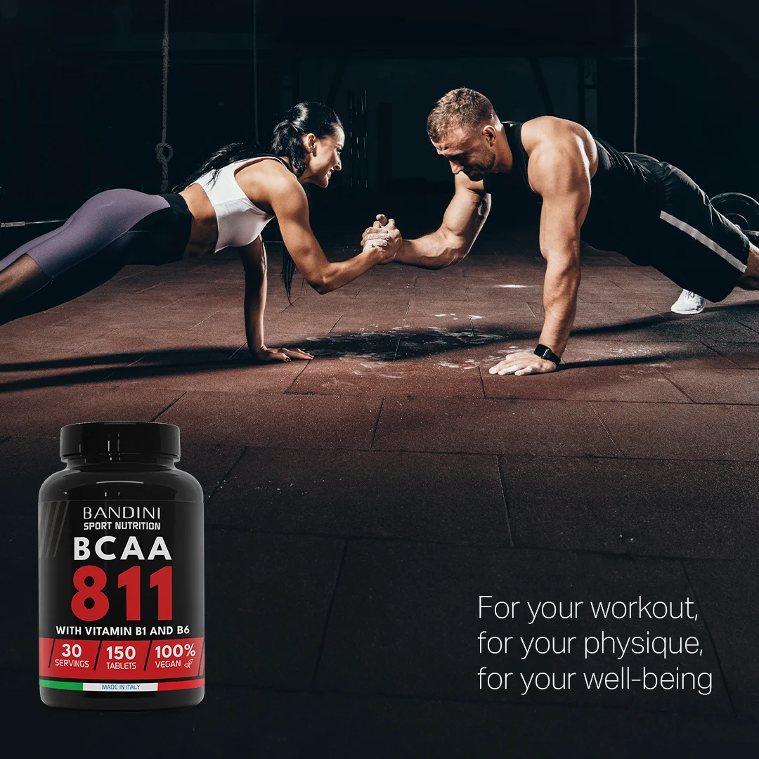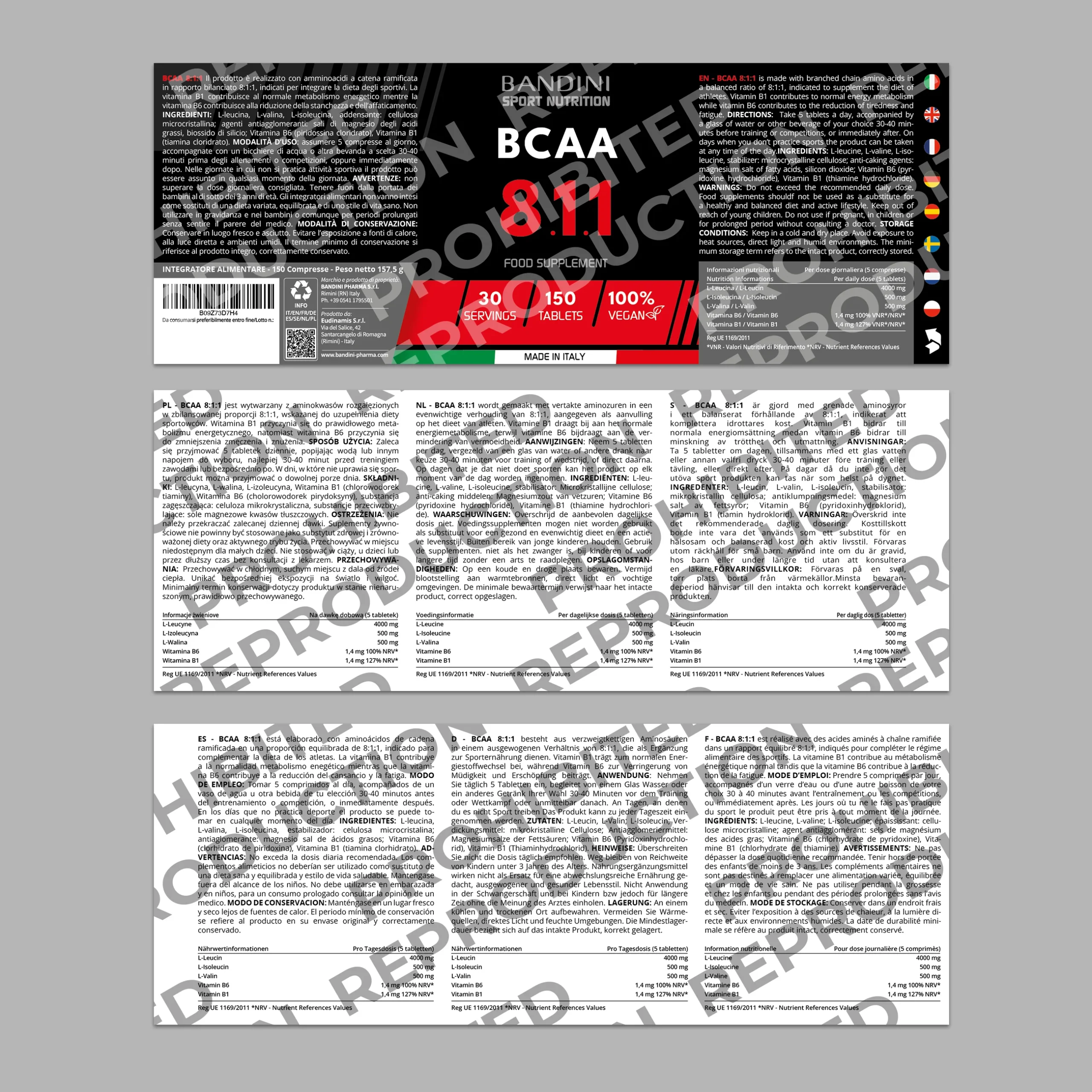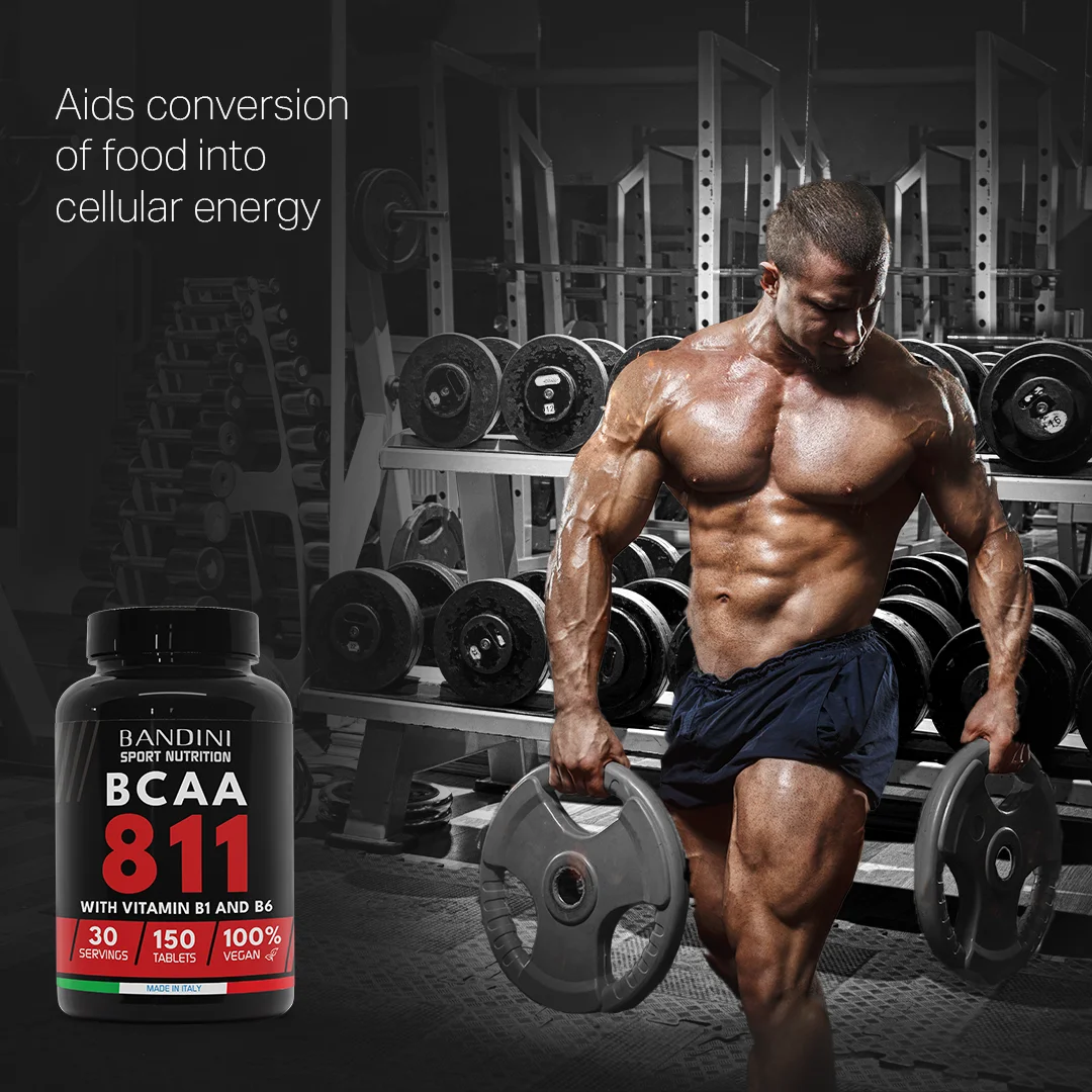 Prehransko dopolnilo na osnovi razvejanih aminokislin z uravnoteženim razmerjem 8:1:1, obogateno z vitaminoma B1 in B6. Pakiranje vsebuje 150 tablet, kar zadošča za 30 odmerkov. Aminokisline BCAA podjetja Bandini Pharma so preizkušene za ohranjanje in gradnjo mišične mase, zagotavljajo pravilno količino levicina, valina in izolevcina kot dodatek k prehrani in športni prehrani.