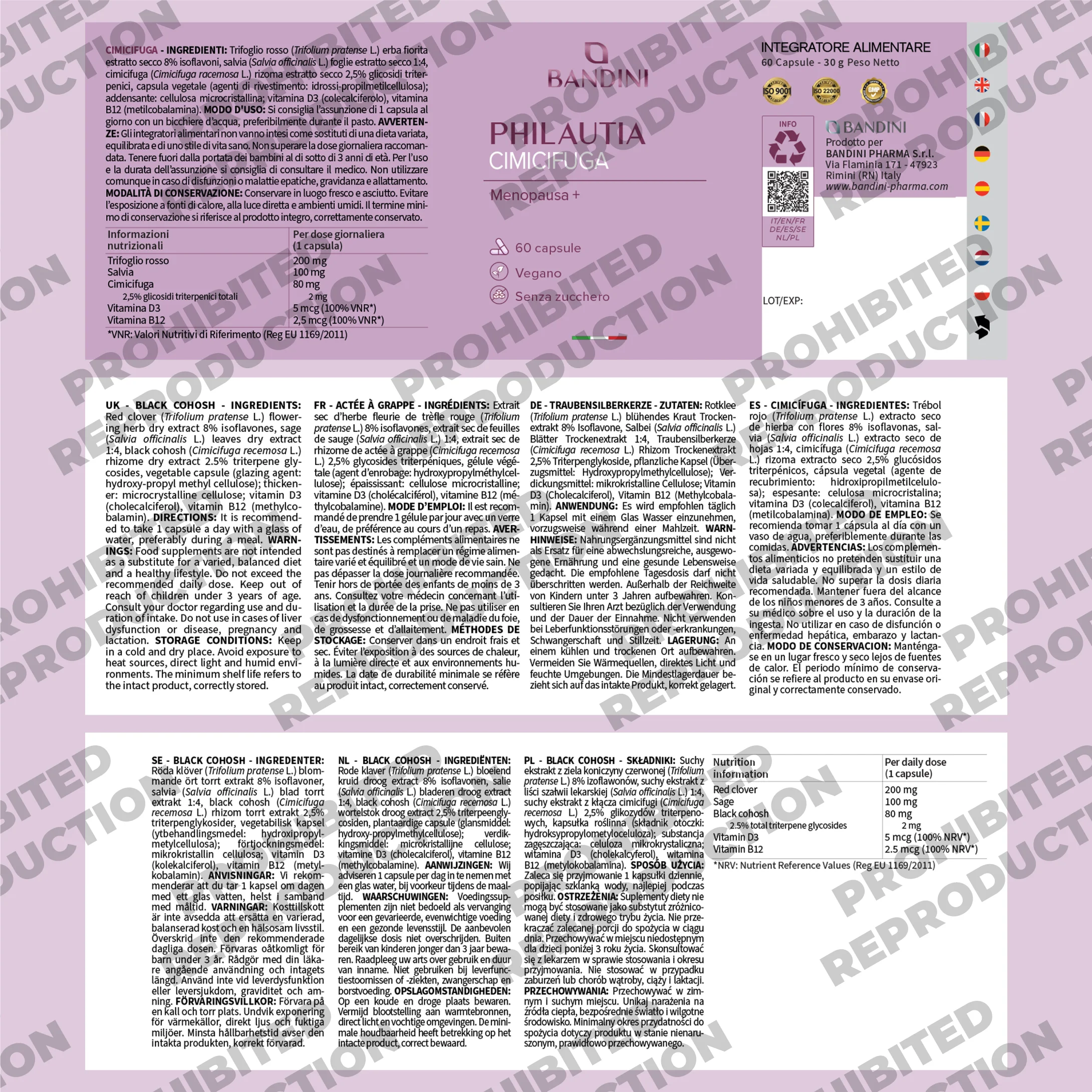 Cimicifuga je prehransko dopolnilo na osnovi suhega izvlečka Actaea Racemosa z rdečim deteljo, žajbljem, vitaminoma D3 in B12.