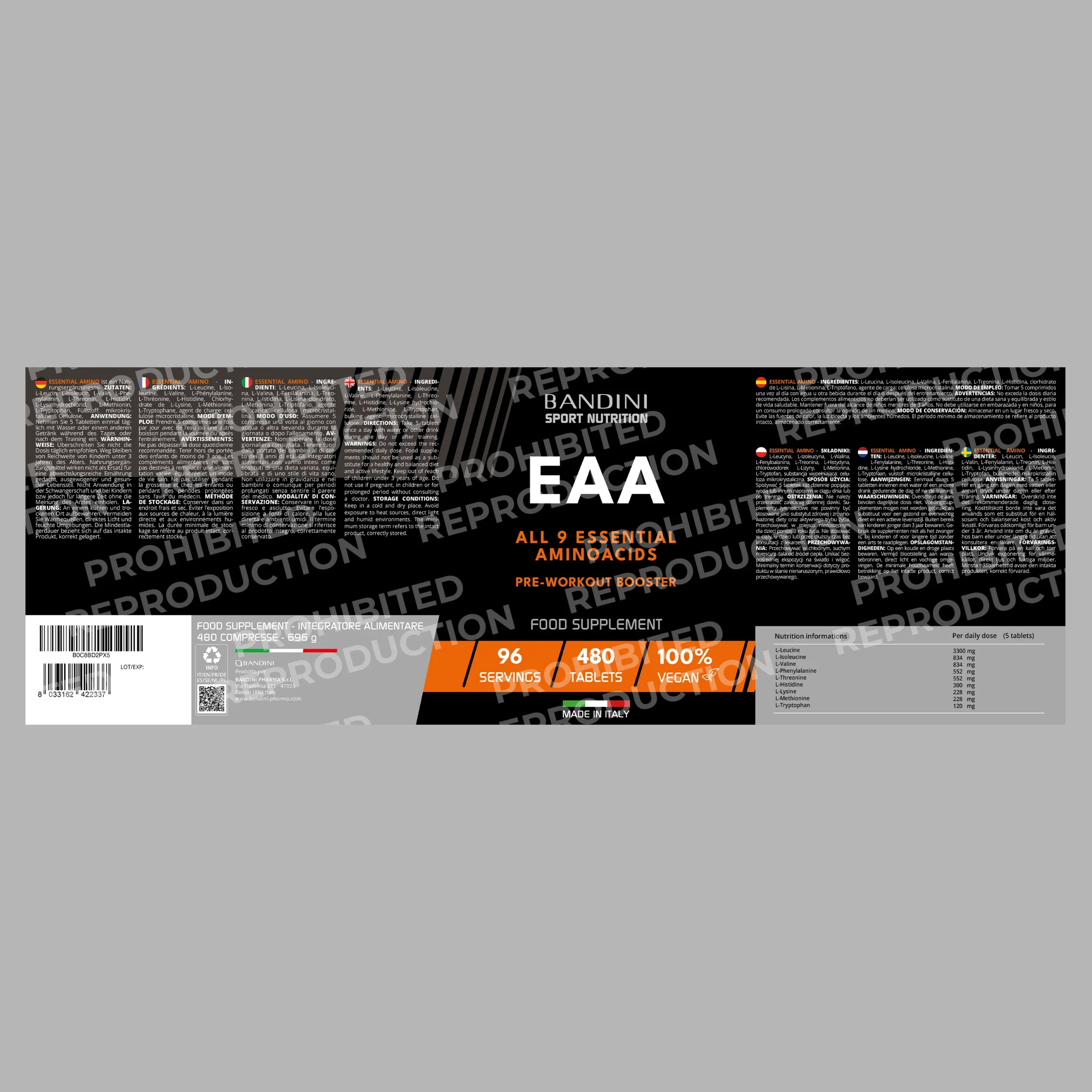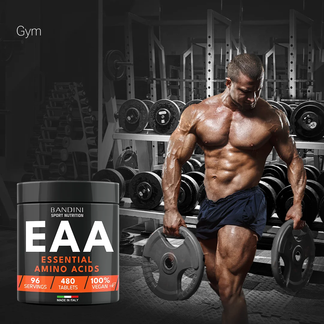 Prehransko dopolnilo z esencialnimi aminokislinami: L-levcin, L-lizin, L-fenilalanin, L-izolevcin, L-valin, L-metionin, L-treonin, L-histidin, L-triptofan. Embalaža vsebuje 480 tablet za 80-dnevno uporabo. EAA Bandini so testirane za ohranjanje in gradnjo mišične mase, podpiranje mišične mase in spodbujanje njene rasti, zagotavljajo pravilno količino aminokislin, tudi esencialnih, ter dopolnjujejo športno prehrano.