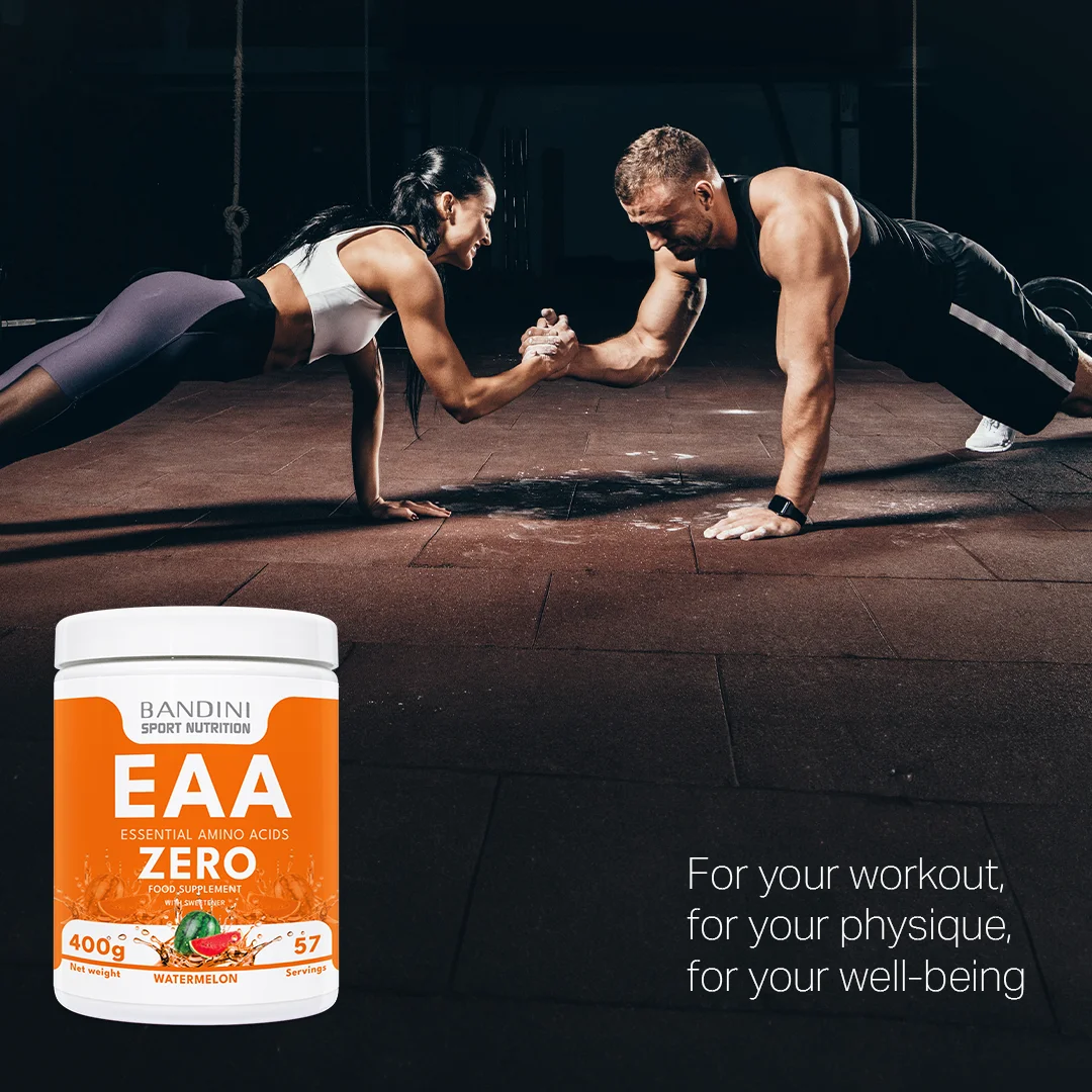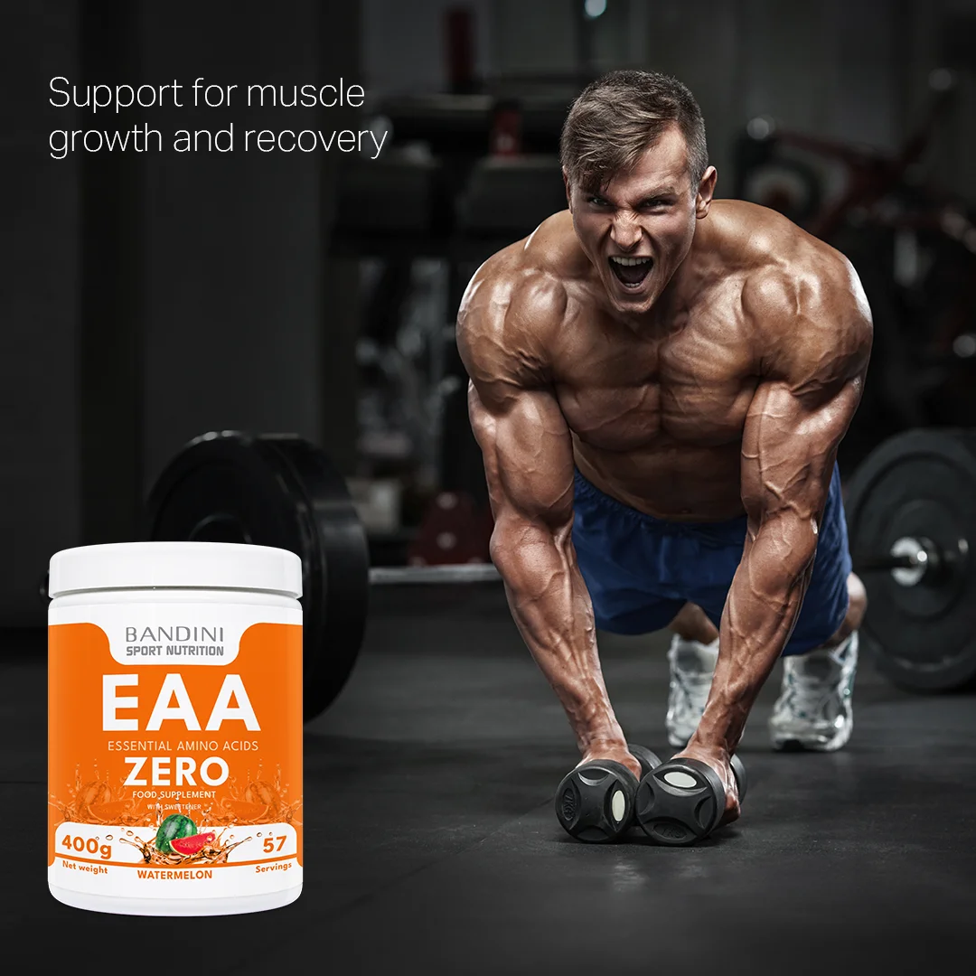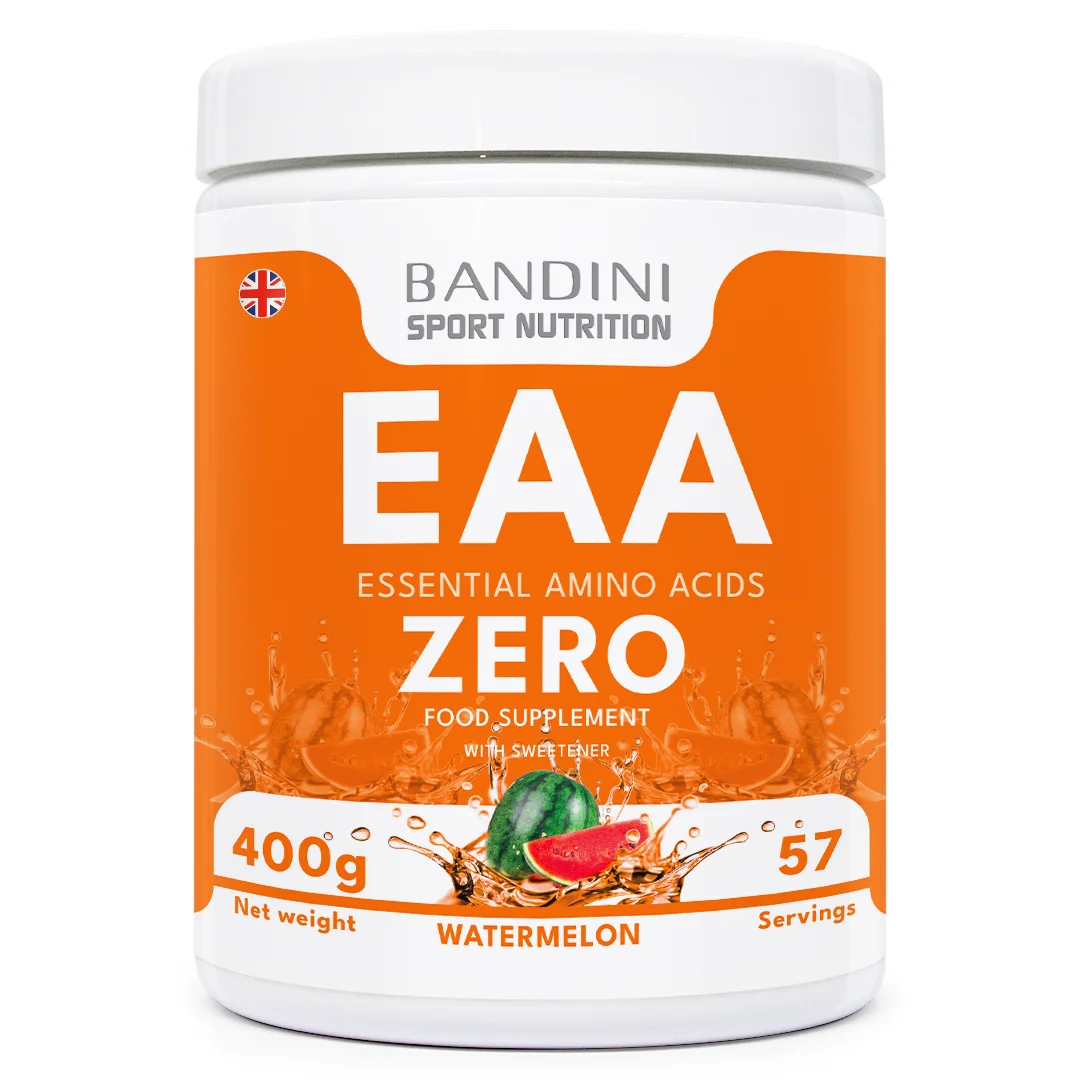 Prehransko dopolnilo na osnovi esencialnih aminokislin: L-levcin, L-lizin, L-fenilalanin, L-izolevcin, L-valin, L-metionin, L-treonin, L-histidin, L-triptofan. Embalaža vsebuje 400 g prahu, kar zadostuje za 57 odmerkov. EAA Bandini Pharma so testirane za ohranjanje in gradnjo mišične mase, podpiranje mišične mase in spodbujanje njene rasti, zagotavljajo pravilno količino aminokislin, tudi esencialnih, ter dopolnjujejo športno prehrano. Izdelek lahko sčasoma razvije naravne grudke, ki ne vplivajo na kakovost.