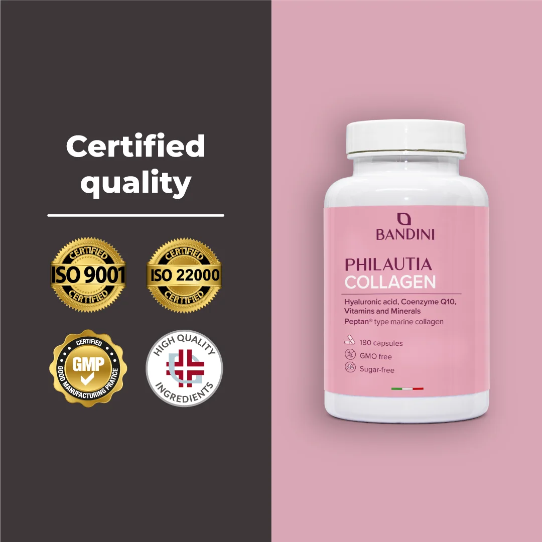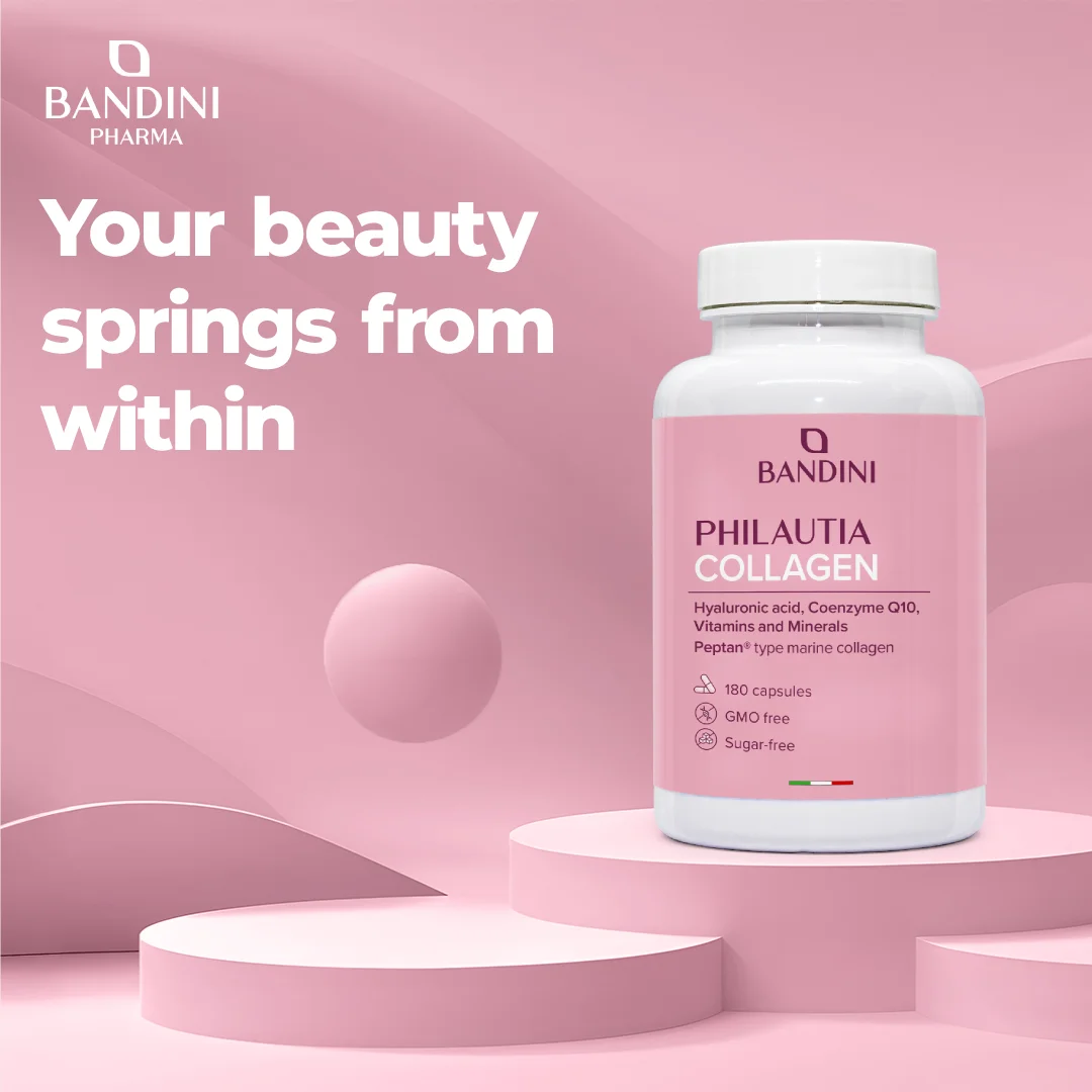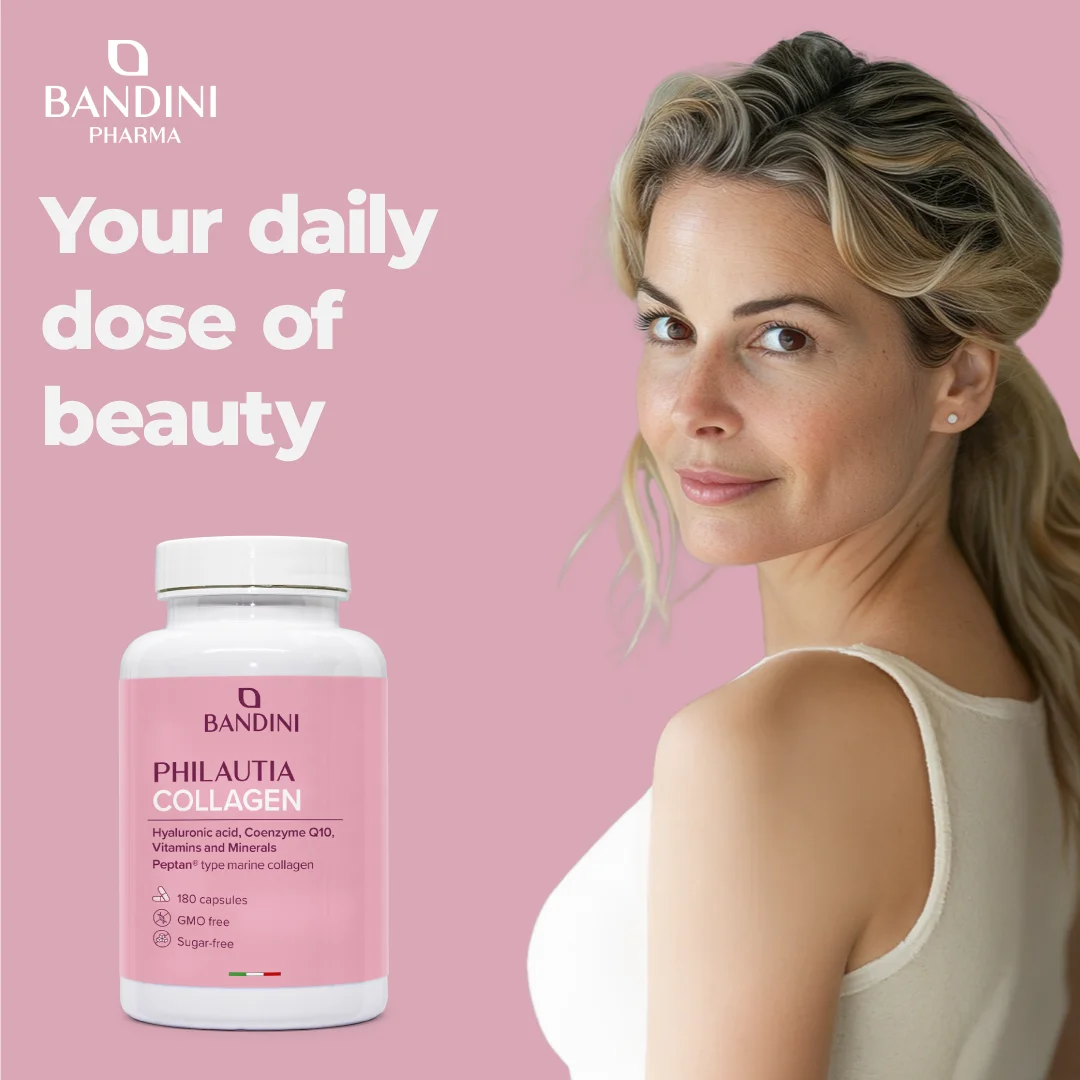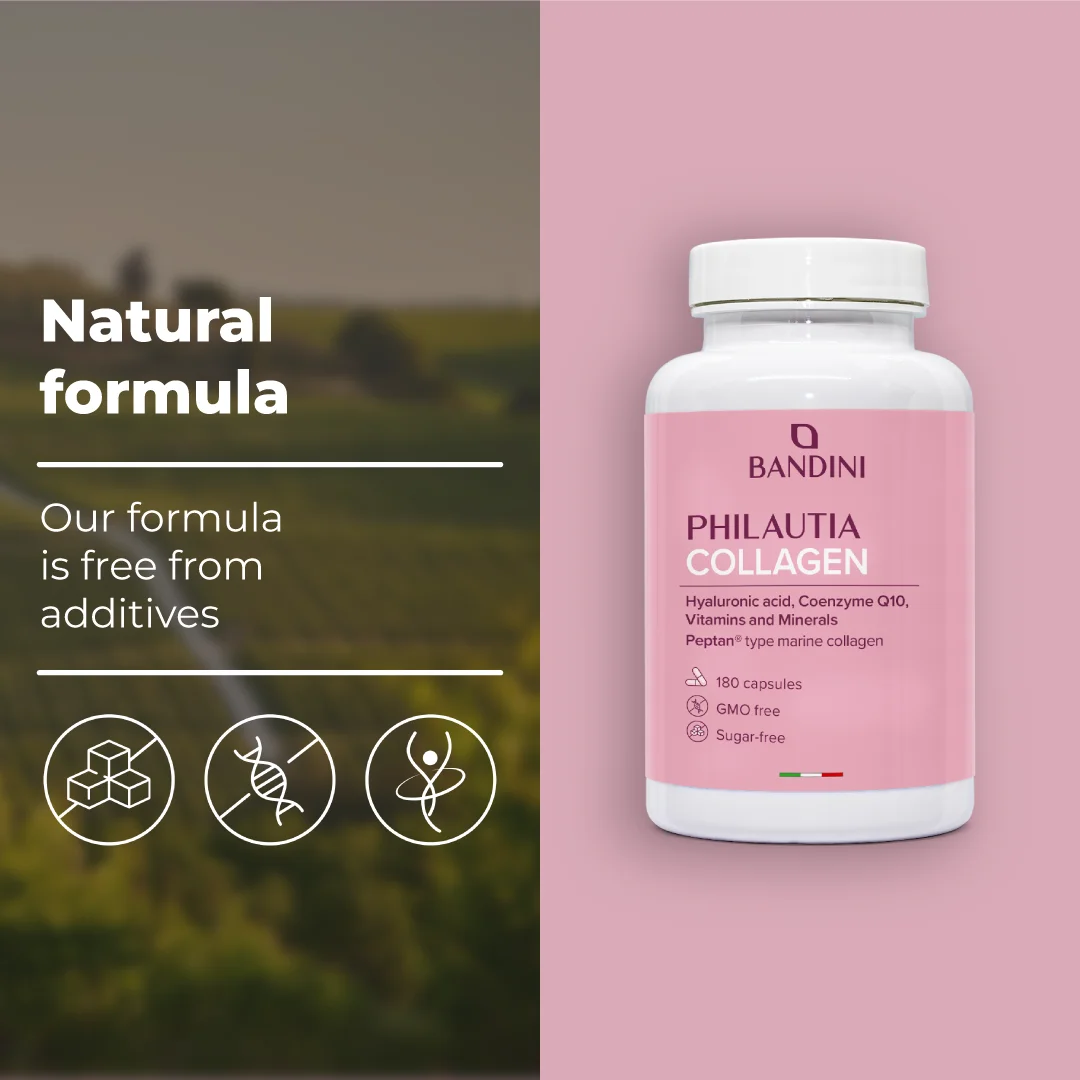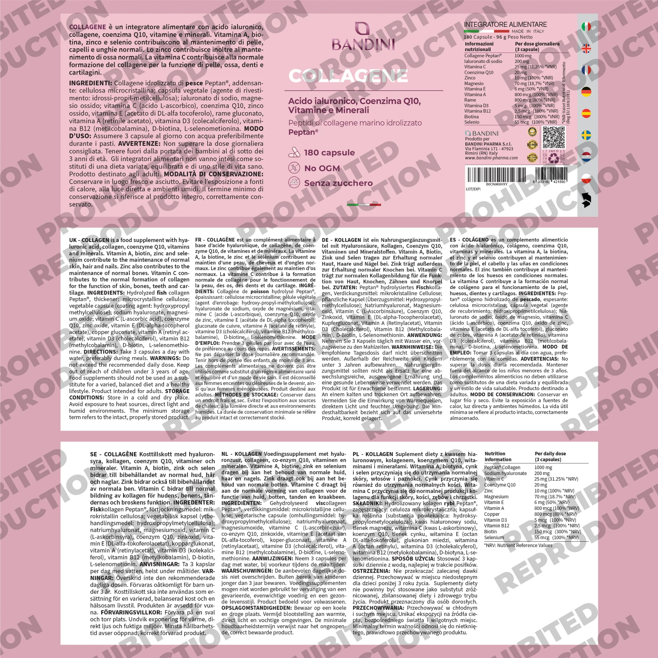 Zahvaljujoč hidroliziranemu kolagenu linije Bandini lahko izkoristiš 1000 mg kolagena in 200 mg hialuronske kisline na dan (največji dnevni odmerek). Ta formula cilja na ohranjanje mladosti, mehkobo in sijaj tvoje kože ter spodbuja zdravje sklepov. Naš prehranski dodatek vsebuje 180 kapsul, ki jih boste lahko uživali v zadostni zalogi do 60 dni.