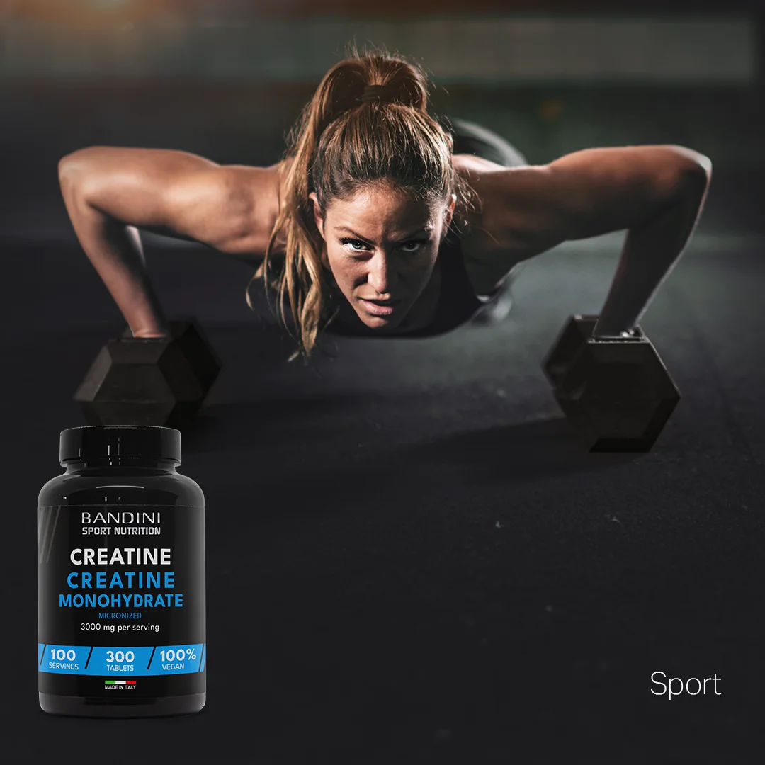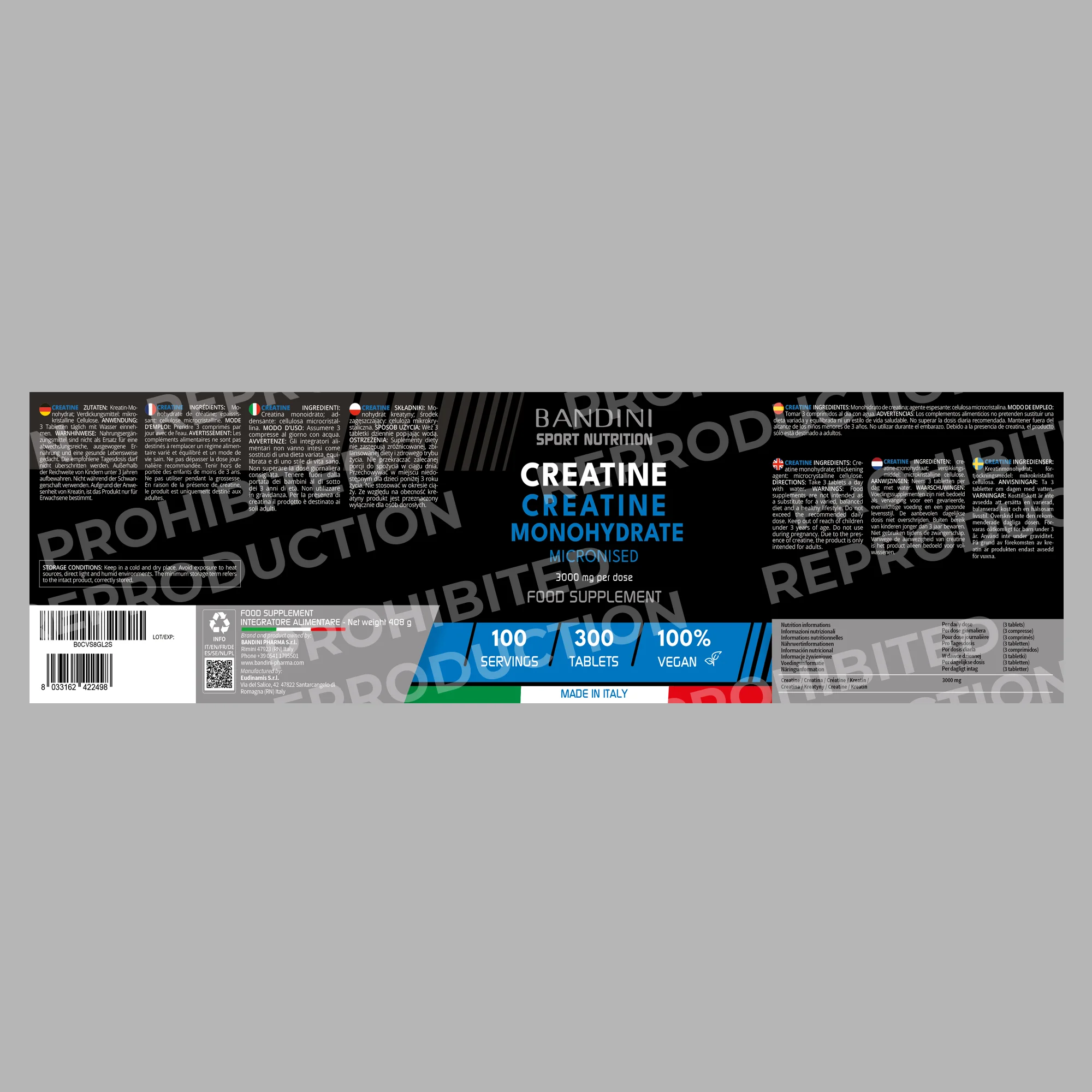 Prehransko dopolnilo v tabletah z 100% kreatin monohidrata (1 dnevni odmerek = 3000 mg kreatina). Pakiranje vsebuje 100 odmerkov. Proizvedeno v Italiji.