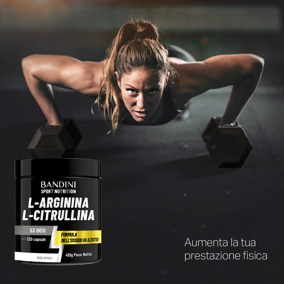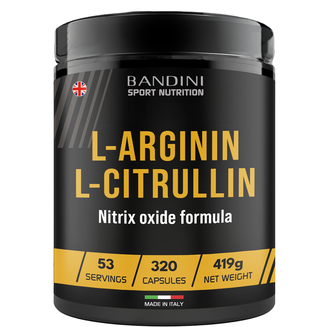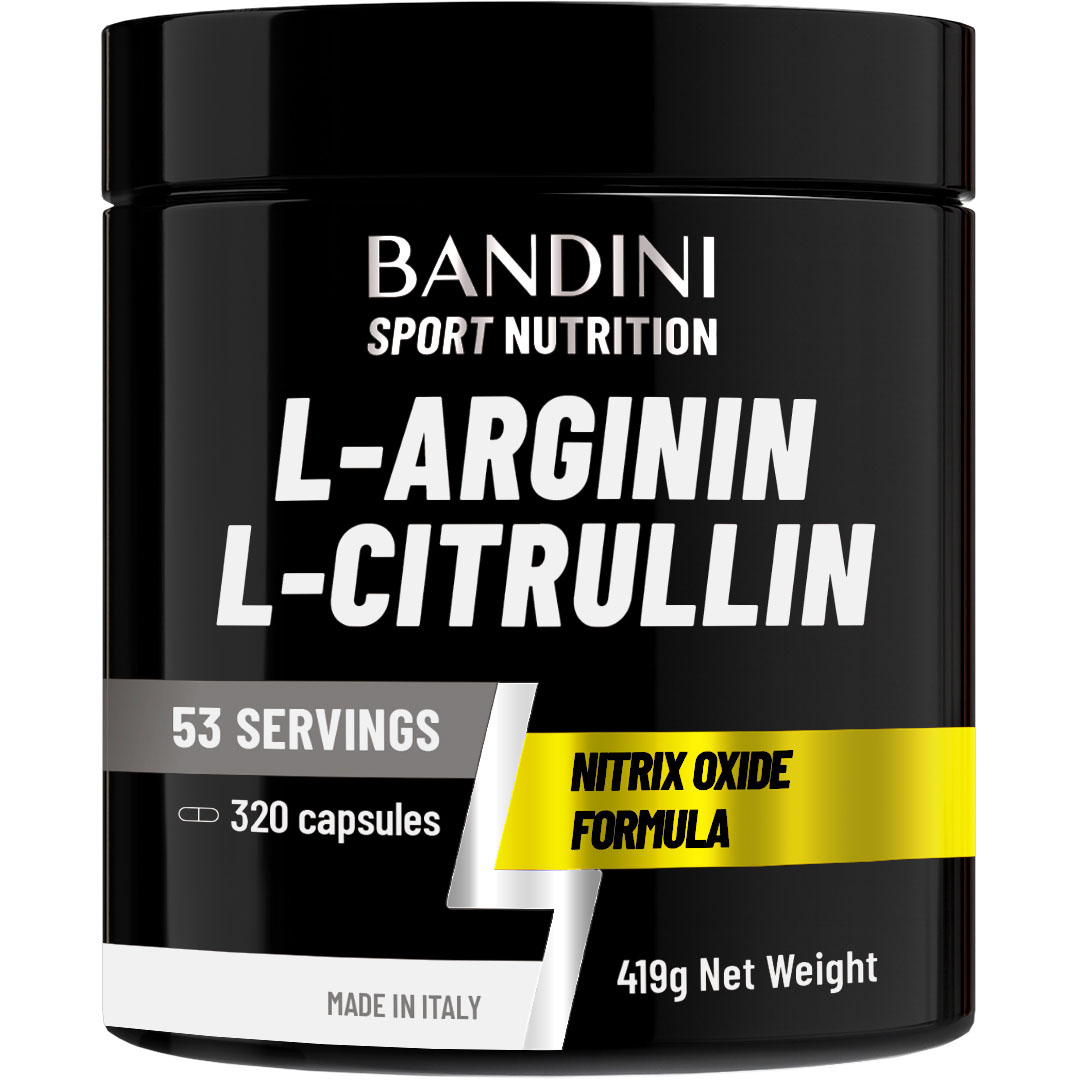 L-Arginin + L-Citrulin 320 kapsul proizvajalca Bandini Pharma je prehransko dopolnilo z visokim odmerkom 3300 mg arginina in 3300 mg citrulina na dnevni odmerek, ki je idealen za podporo regeneraciji mišic.
