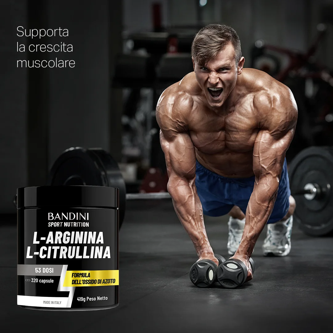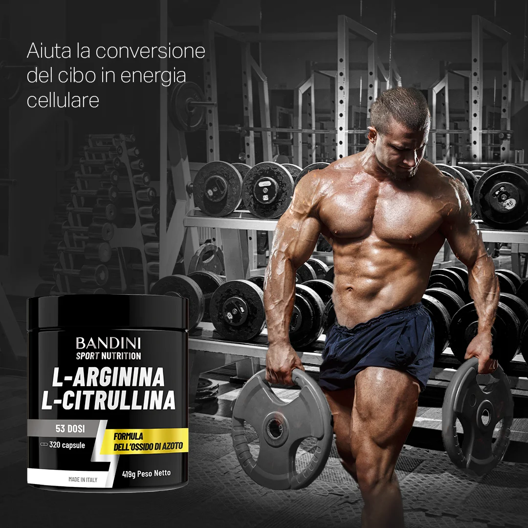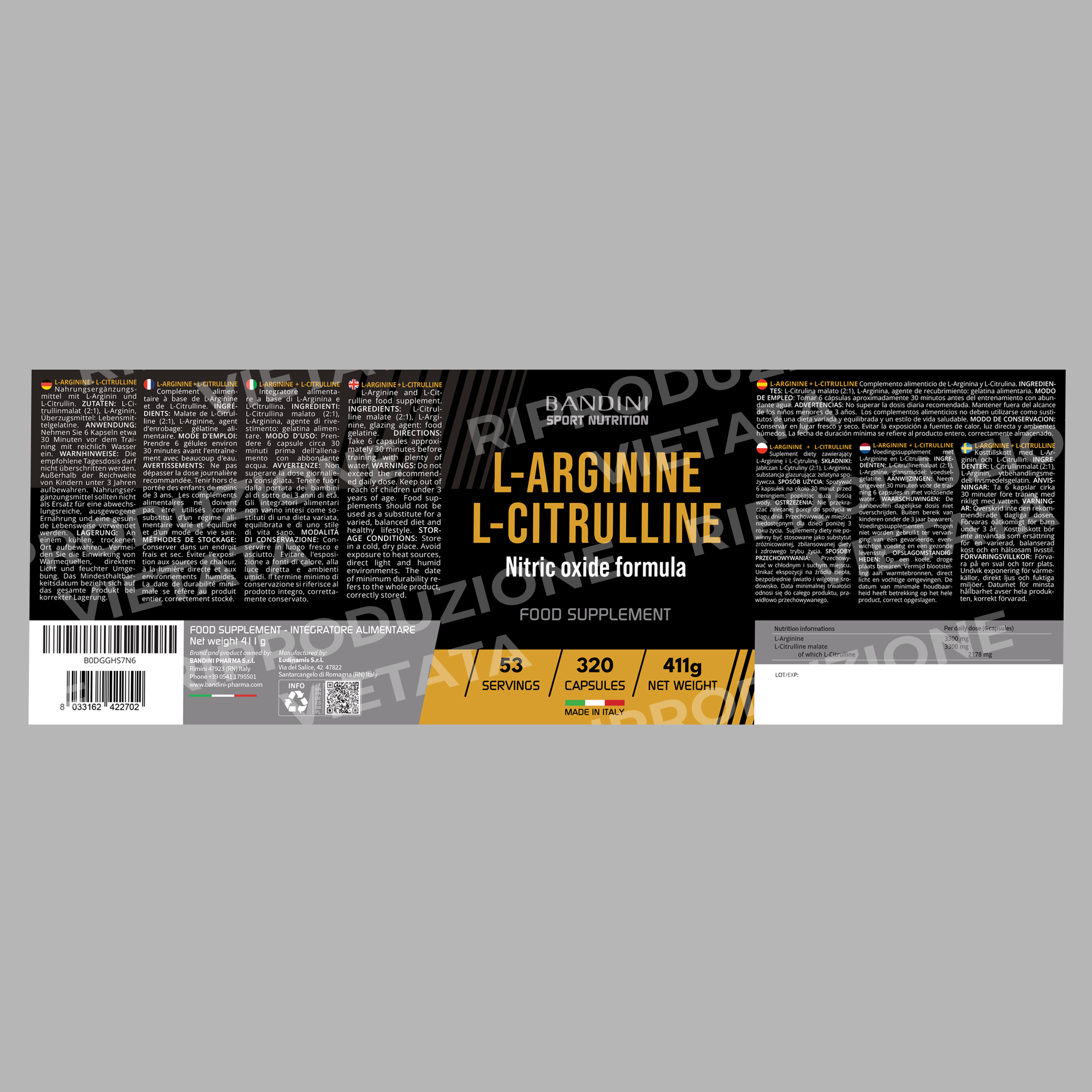 L-Arginin + L-Citrulin 320 kapsul proizvajalca Bandini Pharma je prehransko dopolnilo z visokim odmerkom 3300 mg arginina in 3300 mg citrulina na dnevni odmerek, ki je idealen za podporo regeneraciji mišic.