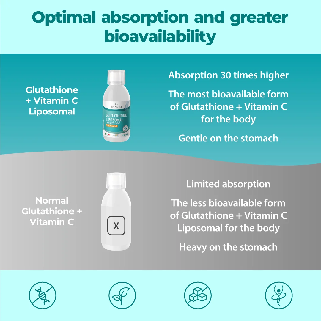 Naša inovativna liposomska tehnologija ščiti aktivne sestavine pred želodčno kislino in omogoča njihovo neposredno absorpcijo v celice. Ta napredna formulacija zagotavlja, da glutation in vitamin C dosežeta največjo učinkovitost. S kombinacijo izbranih sestavin in priročno tekočo osnovo je to prehransko dopolnilo zanesljiva izbira za vse, ki iščejo celovito podporo za dobro počutje celic in imunskega sistema.
