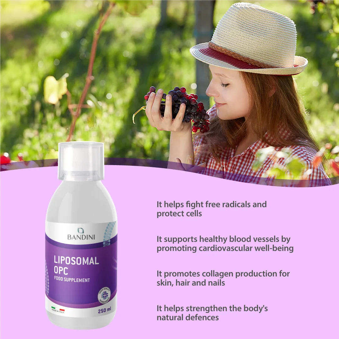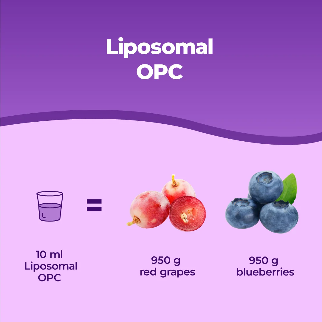 Z 200 mg izvlečka grozdnih pešk (oligomernih proantocianidinov), bogatega z OPC, na dnevni odmerek naše dopolnilo zagotavlja visoko učinkovitost in dobro počutje. OPC so znane rastlinske spojine, ki jih najdemo v grozdju in so cenjene zaradi svojih antioksidativnih lastnosti, ki pomagajo ščititi celice pred oksidativnimi poškodbami. Liposomska tehnologija zagotavlja optimalno absorpcijo aktivnih sestavin.