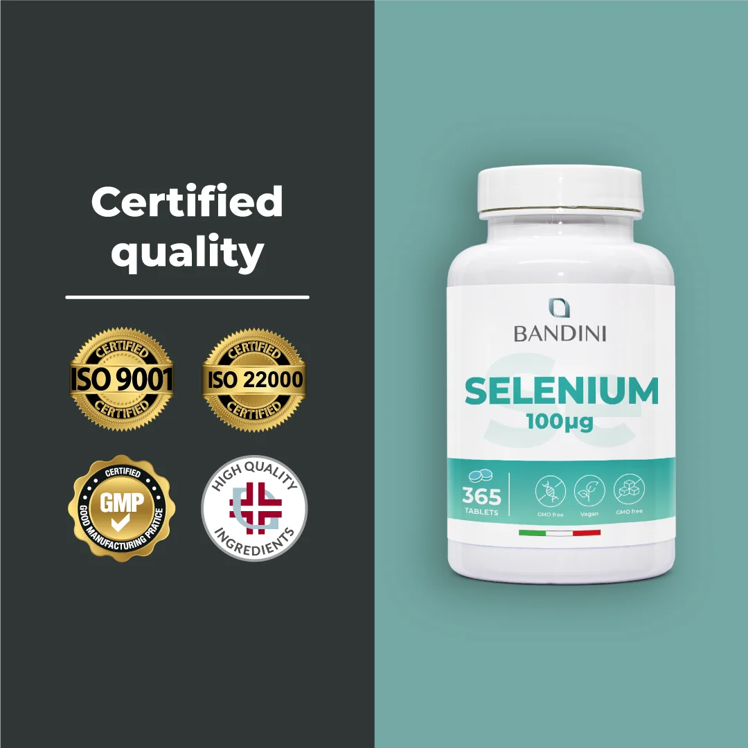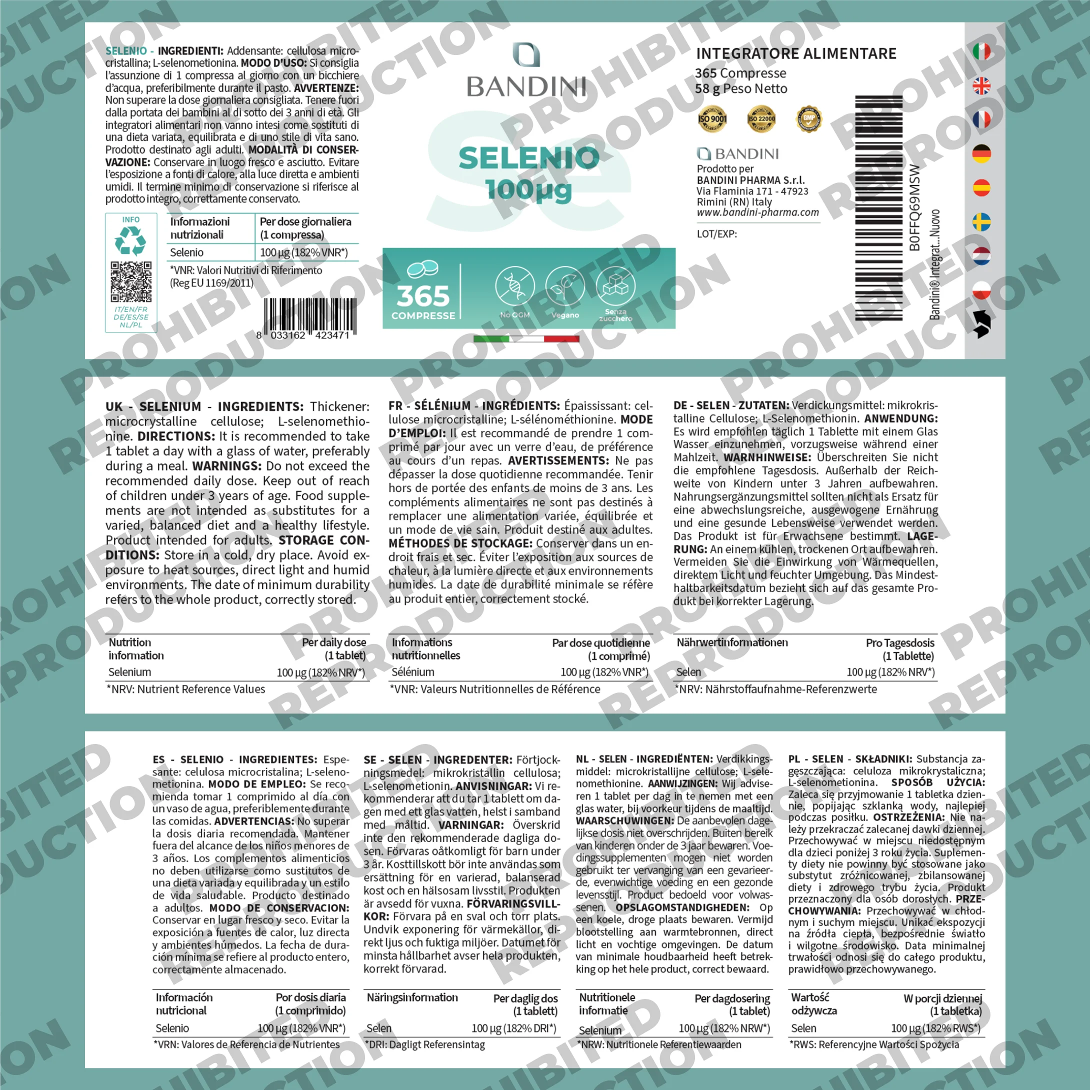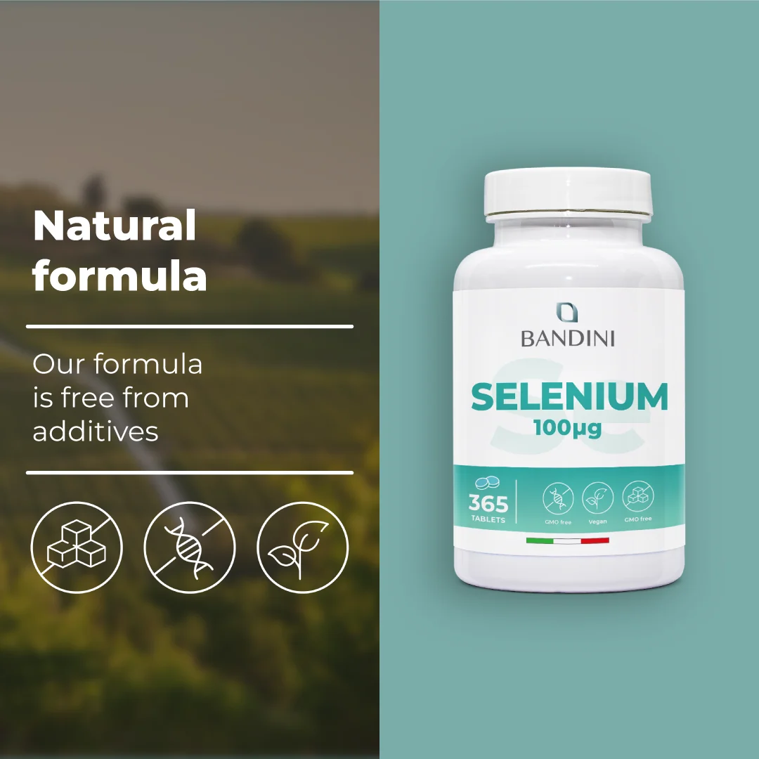 Naš prehranski dodatek vsebuje 100 mcg čistega selena na tableto, kar je v skladu z italijanskimi predpisi. Z zaužitjem ene tablete na dan vam pakiranje s 365 tabletami zagotavlja zaloge za celo leto.