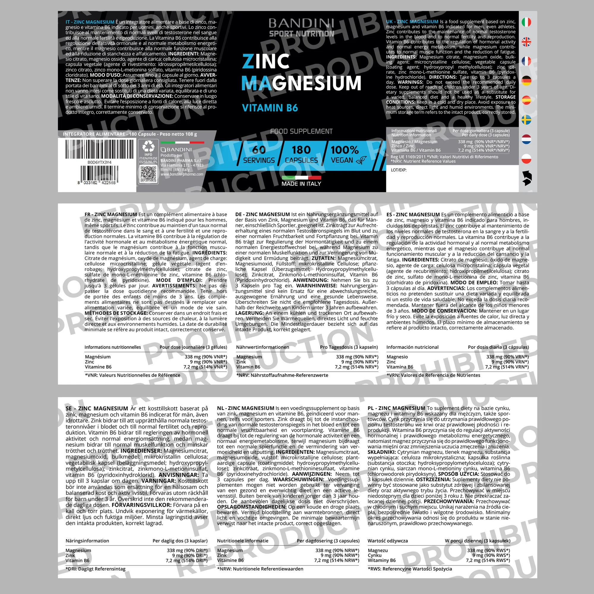 Prehransko dopolnilo z visokim odmerkom 338 mg magnezija, 9 mg cinka in 7,2 mg vitamina B6 na dnevni odmerek (3 kapsule). Pakiranje s 180 kapsulami za en mesec (60 odmerkov).